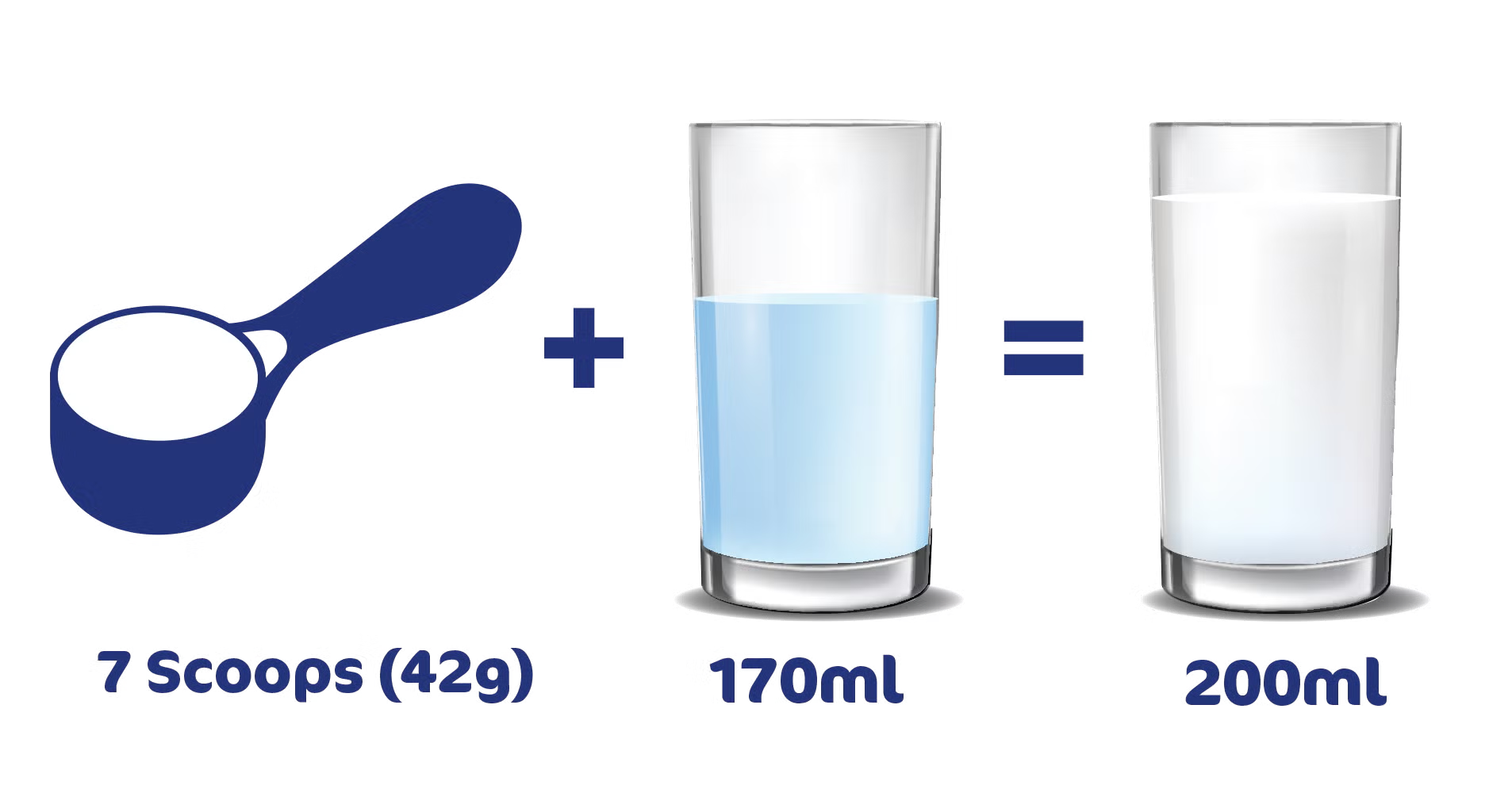 - Gradually mix 7 scoops (42g) of milk powder into 170ml of lukewarm water