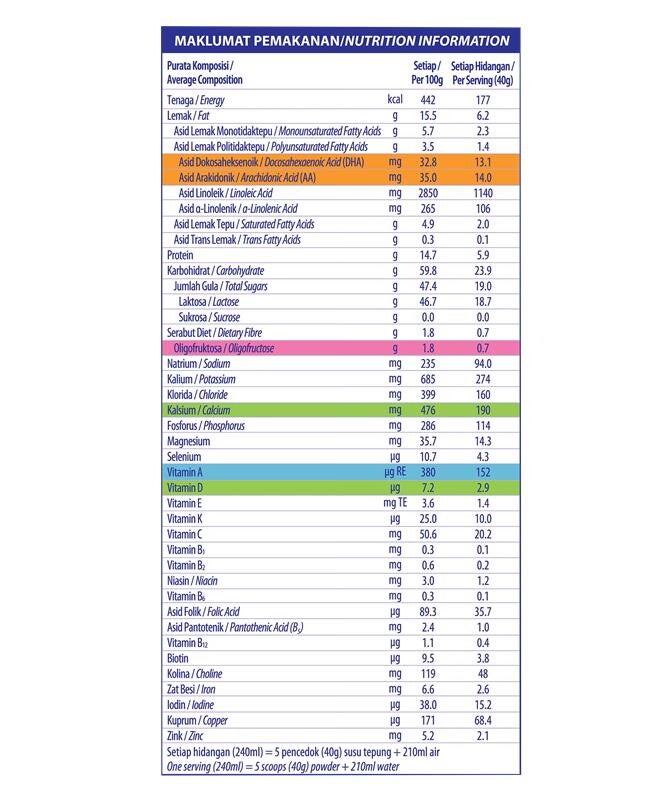 Skimmed Milk Powder (Cow's Milk), Whey Protein (Cow's Milk), Maltodextrin, Vegetable Oils (Palm Olein, Low Erucic Rapeseed, Sunflower), Lactose (Cow's Milk), Oligofructose, Minerals (Calcium Carbonate, Potassium Citrate, Potassium Hydroxide, Sodium Citrate, Sodium Chloride, Potassium Carbonate, Ferrous Sulphate, Sodium Phosphate, Magnesium Chloride, Zinc Sulphate, Manganese Sulphate, Cupric Sulphate, Potassium Iodide, Sodium Selenite), Emulsifiers (Soya Lecithin And Monoglycerides), Vitamins (Choline Chloride, Ascorbic Acid, Niacin, E, B5, A, B1, B6, B2, Folic Acid, Beta-Carotene, K1, Biotin, D3, B12), Docosahexaenoic Acid (from Schizochytrium sp. Oil), Arachidonic Acid (from Mortierella alpina Oil), Acidity Regulator (Citric Acid), Flavouring (Vanilla).